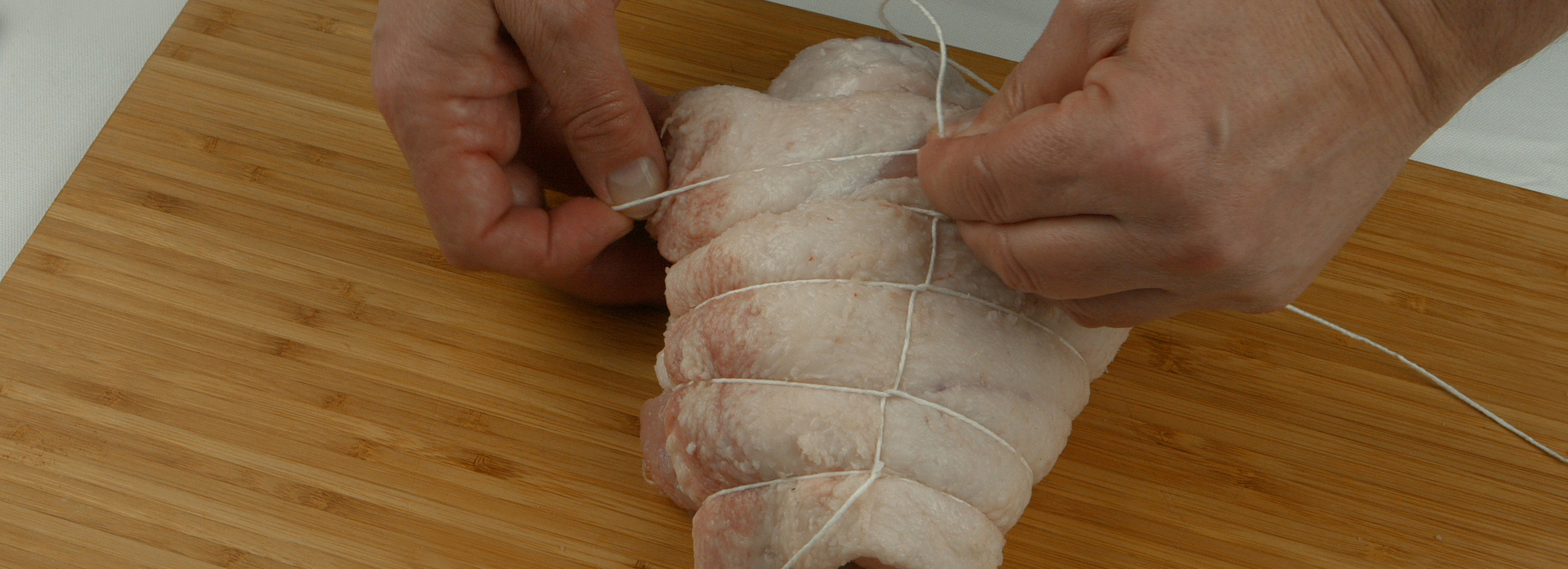 Para empezar cogemos la panceta de cerdo y la empezaremos a enrollar. Bridar es un término profesional culinario que significa atar. Una vez tenemos la panceta enrollada, cogeremos hilo de fibra natural para empezar a bridarla. Primero introduciremos el hilo por debajo, al principio de la pieza, haremos un nudo y lo apretaremos un poco.