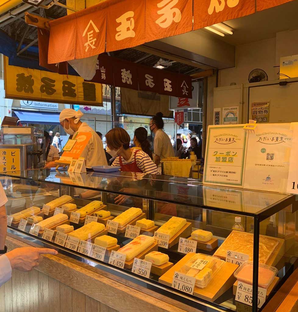 Tienda de tamagoyaki en los alrededores del mercado Tsukiji (2023)