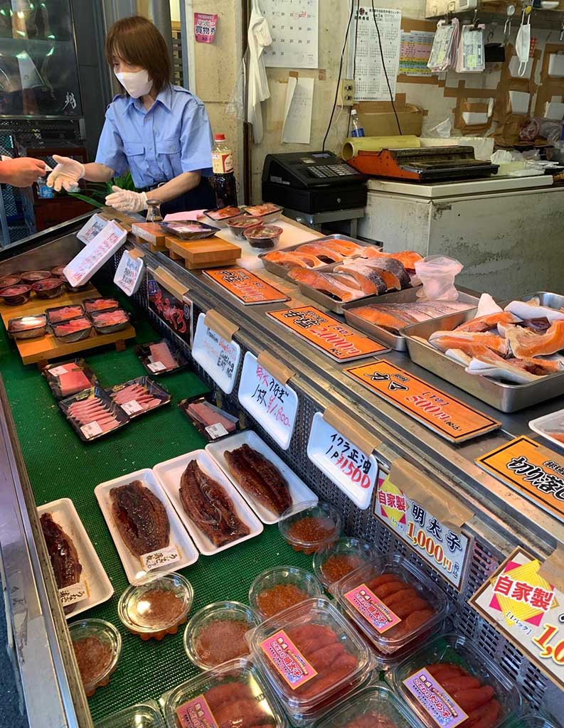 Tienda de huevas de ikura y salmón en los alrededores del mercado Tsukiji (2023)