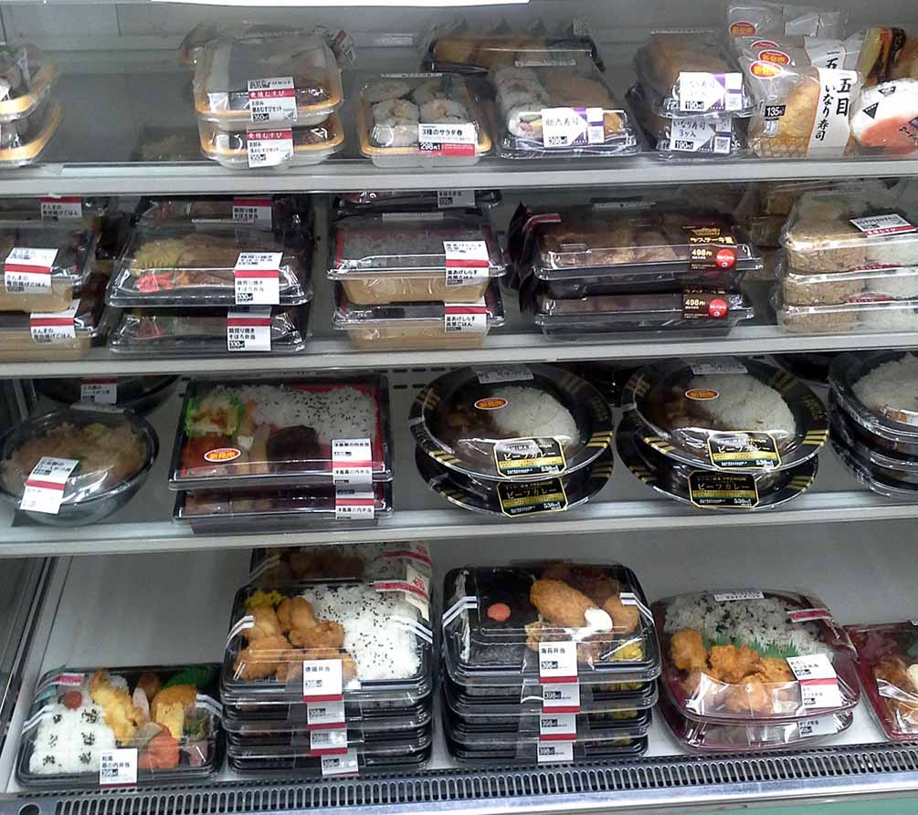 Bento o platos para calentar: suelen tener curry, pollo, croquetas, arroz con toppings, etc.