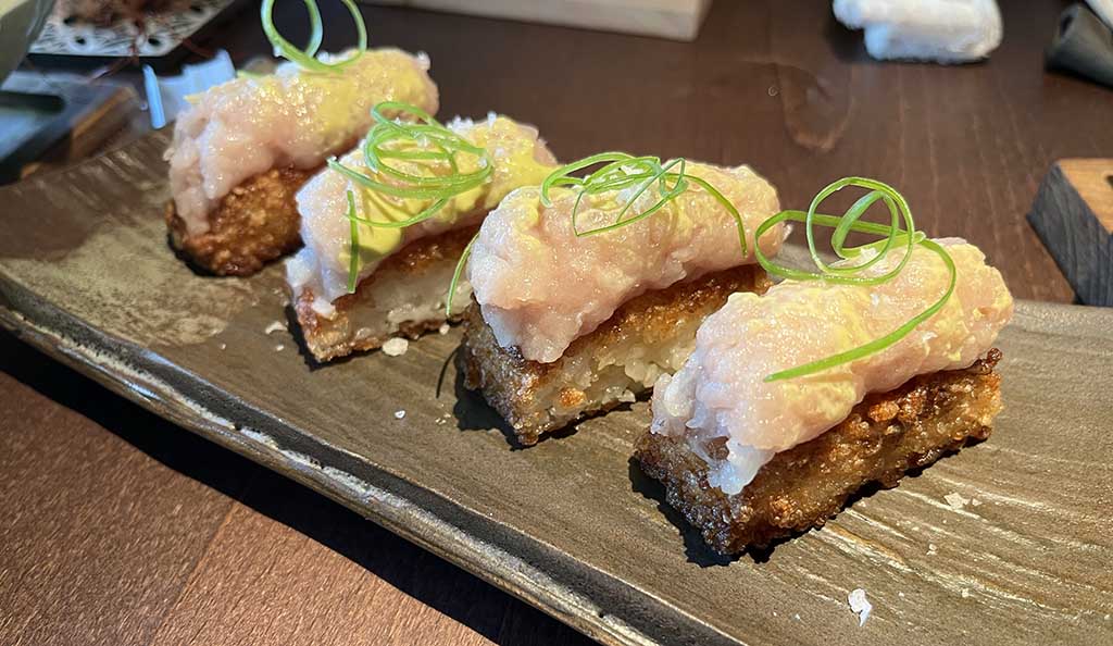 A continuación llegaron los bocados de sushi: un nigiri de hamachi con arroz crujiente, impecable en temperatura y textura, y un tartar de otoro que demostraba la calidad del pescado y el respeto por su sabor natural.