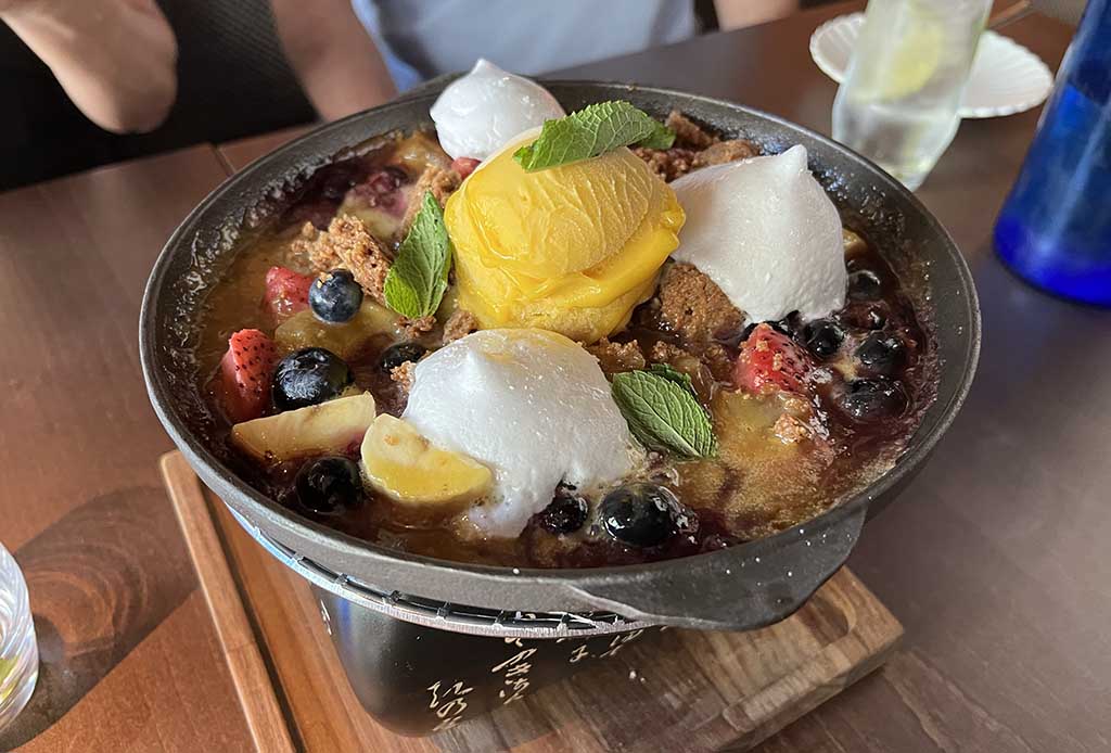 Al surtido de sashimi -vieiras, akami, chutoro, otoro y salmón- le siguió un ceviche con rabanitos, que aportó un contrapunto cítrico antes del miso seabass con crispy kale, suave y aromático. Seguimos con costillas de cordero marinadas y cocinadas en la robata llegaron con un ahumado discreto. De postre, el Toban Yaki —maracuyá, chocolate blanco, crumble de almendra, sorbete y helado de mango.