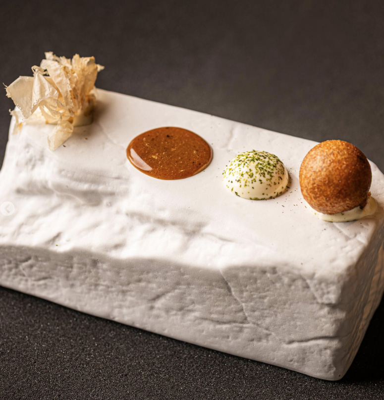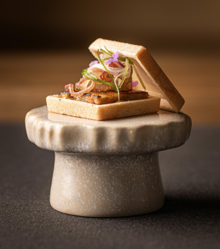 El chef Steven Wu, formado en cocinas de Tokio y Kioto, trabaja con una sola opción: un menú omakase sorpresa. La base es kaiseki, con atención a la temporada y una secuencia que alterna técnicas y cocciones para buscar equilibrio entre lo que ves y lo que pruebas. El local también forma parte de la experiencia. Todo se organiza en cuatro espacios: una recepción en forma de pasillo-jardín que sugiere las estaciones, una barra japonesa donde sucede la parte central del menú, un salón del té con la ceremonia explicada de manera sencilla y, al final, una coctelería con música japonesa donde puedes cerrar con un whisky o un cóctel.